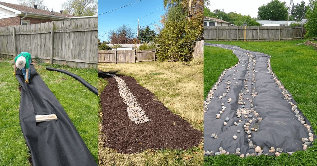 A French drain involves digging a trench and placing a corrugated pipe with small rocks/gravel around it. Its purpose is to drain water away from your home and prevent water damage.