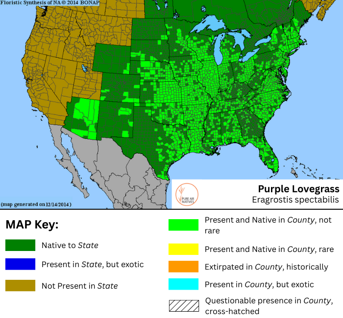 Purple Love Grass (Eragrostis spectabilis) is a hardy, low-growing native grass perfect for dry, sunny landscapes. Growing 1 to 2 feet tall, it thrives in poor soils, full sun, and even beneath Black Walnut trees.