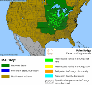 Palm Sedge (Carex muskingumensis) is a striking native sedge with glossy green leaves arranged in a palm-like pattern along upright stems. Native to floodplain forests of the central and upper Midwest, it forms dense clumps that spread by rhizomes and self-seeding.